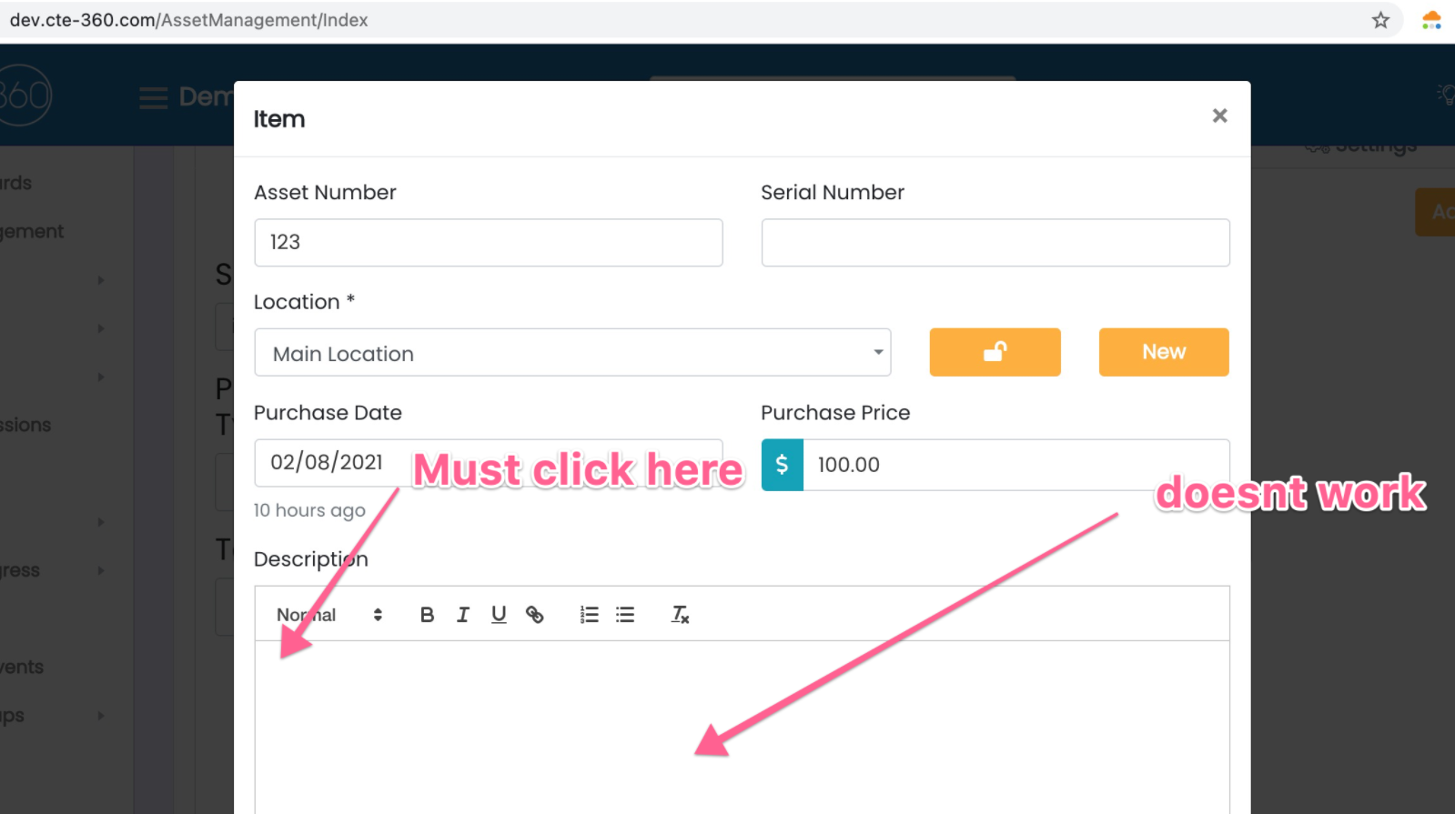Clicking in the text area in quill doesn't work unless you click at the very top.